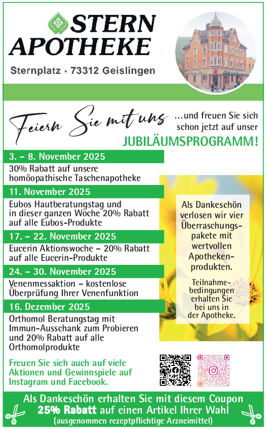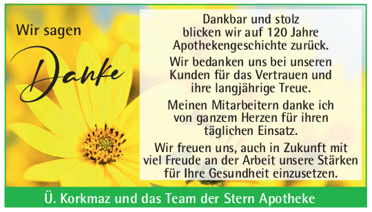 Von November bis Dezember dieses Jahres will sich Ümmühan Korkaz nun mit ihrem Team bei der Kundschaft durch ein Jubiläumsprogramm und Sonderaktionen für die Treue bedanken. Dabei wird sie erneut auf das große Leistungsspektrum des Teams der Stern-Apotheke und der vielen Angebote hinweisen. Brigitte Scheiffele