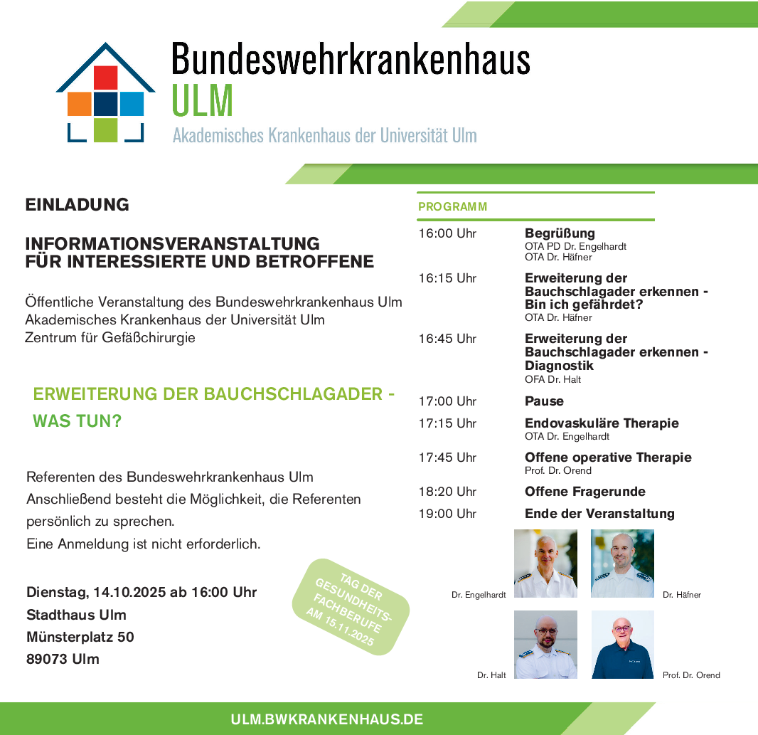 Am Dienstag, dem 14. Oktober ab 16 Uhr informieren vier Spezialisten des Zentrums für Gefäßchirurgie des BWK Ulm im Stadthaus über die Erweiterung der Bauchschlagader: Sie klären über Risikofaktoren, Diagnosemöglichkeiten und Therapieverfahren auf und gehen auf die Anliegen der Besucher bei einer anschließenden offenen Fragerunde ein.