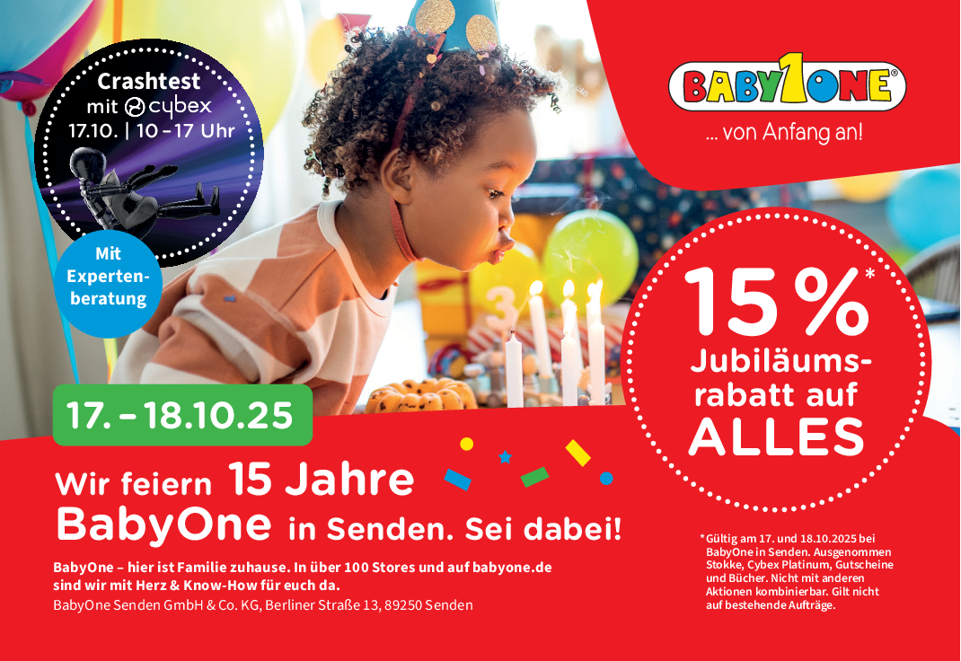 „15 Jahre sind ein besonderer Meilenstein für uns. Wir sind stolz darauf, so vielen Familien aus der Region rund um Senden und Ulm beim Start ins Familienleben zur Seite stehen zu dürfen“, sagt Inhaber Christian Stoll. Der 43-Jährige führt den Standort in zweiter Generation, unterstützt von einem engagierten zwölfköpfigen Team rund um Filialleiterin Sabrina Pinto. Zum Jubiläum gibt es am 17. und 18. Oktober 2025 einmalig 15 Prozent Rabatt auf das gesamte Sortiment. Zahlreiche Hersteller wie Cybex, My Junior, Nuna, Joie und ABC sind mit eigenen Ständen vor Ort und beraten persönlich.
