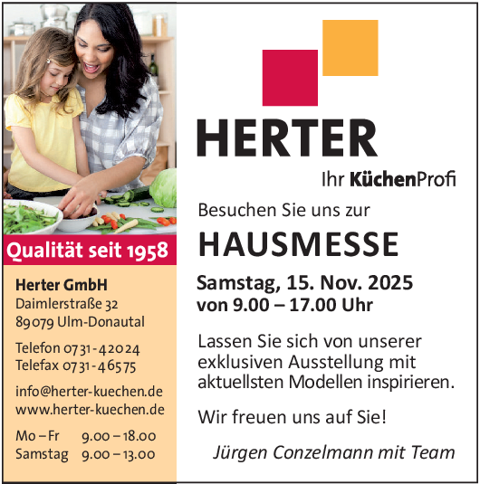 Wer sich vom Herter-Erfolgsrezept überzeugen will, dem sei entweder gleich eine individuelle Terminvereinbarung oder ein Besuch der Hausmesse am 15. November in der Daimlerstraße 32 empfohlen. Das ganze HerterTeam steht für Fragen und Wünsche bereit. Zudem zeigen zwei Köche allen Interessierten, welche Vorteile und Freiheiten Induktionskochfelder bieten und wie gesunde, leckere und wohlschmeckende Gerichte im Dampfgarer gelingen. Leh