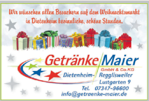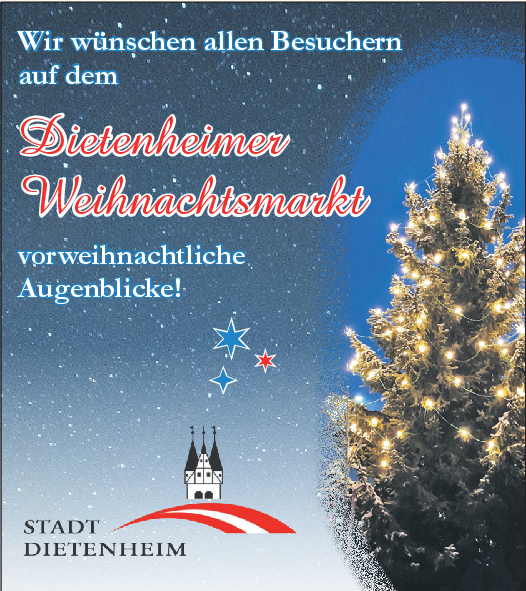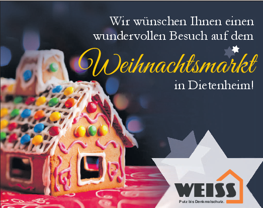 Am ersten Adventssonntag ist es endlich wieder so weit: die Stadt Dietenheim und der örtliche Handwerker- und Gewerbeverein (HGV) laden ein zum Weihnachtsmarkt. Von 11 bis 20 Uhr gibt es auf dem Marktplatz und im Rathaus einiges zu erleben und zu entdecken: Stände mit kreativen Geschenkideen, kulinarische Köstlichkeiten sowie ein abwechslungsreiches Rahmenprogramm.