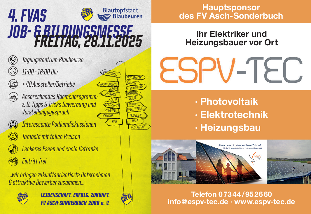 Zusätzlich zu den Infos an Firmen-Ständen gibt es auf der Messe auch ein Rahmenprogramm und Podiumsdiskussionen um 12.20 und 14.40 Uhr - etwa darüber, wie man den besten Beruf für sich findet, worauf Unternehmer Wert legen oder wie man mit dem Kulturwandel in der Arbeitswelt umgeht. Der Einsatz von Vereinsmitgliedern dabei ist enorm - deshalb erhielt der FV Asch-Sonderbuch inzwischen zum dritten Mal den Ehrenamtspreis des Württembergischen Fußballverbands.