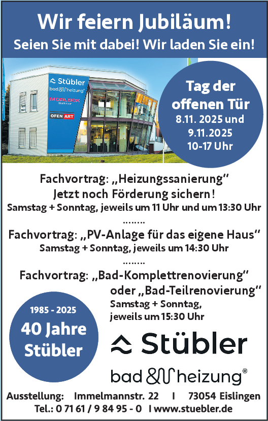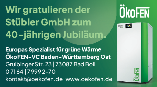 Gleichzeitig setzen die Spezialisten auf nachhaltige Heiztechnologien: Wärmepumpen und Pelletheizungen in Kombination mit Photovoltaik-Anlagen stehen heute im Mittelpunkt, um Energieeffizienz, Umweltbewusstsein und Komfort miteinander zu verbinden. „40 Jahre Stübler sind zugleich 40 Jahre Erfahrung, Innovation und Leidenschaft für Wohnräume“, betont Philipp Schattner. Die Kombination aus traditioneller Handwerkskunst, modernster Technik und individuellem Service macht das Unternehmen zu einem starken Partner für alle, die Wohnträume Realität werden lassen wollen. Mit einem Blick in die Zukunft bleibt Stübler seinem Anspruch treu: Wohnräume zu schaffen, die inspirieren, begeistern und langfristig Bestand haben. pm