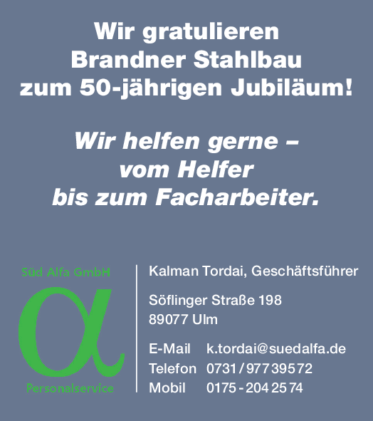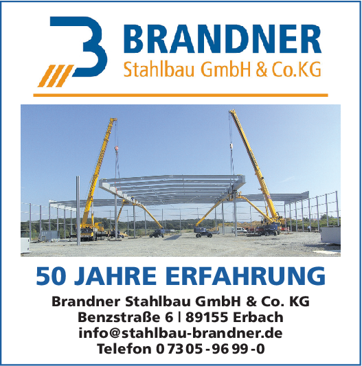 Seit 50 Jahren hat Stahlbau Brandner Rang und Namen. Bei auszuführenden Aufträgen kennt man keine Grenzen, weder was Größe noch was die Entfernung zum Kunden betrifft. Geländer und Überdachungen von Stahlbau Brandner findet man keineswegs nur in der Region, sondern überall in Deutschland und weltweit. Gegründet wurde der Betrieb 1975 von Helmut Brandner und seiner Frau Margarete durch die Übernahme einer Bauschlosserei in Ulm-Ermingen. Die Räumlichkeiten boten allerdings mit 200 Quadratmetern sehr beengte Platzverhältnisse. Schon zwei Jahre später erfolgte deshalb der Umzug nach Erbach ins Industriegebiet. Zu einer Zeit als rundum noch grüne Wiesen das neue Firmengelände umgaben. Schon bald, 1976, stieg Sohn Herbert in den Betrieb ein, der aufgrund seines jungen Alters die Meisterschule nur mit einer Sondergenehmigung hatte absolvieren können. Die Auftragslage entwickelte sich so gut, dass 1985 ein zweiter und 1995 ein dritter Bauabschnitt folgten; im Jahr 2015 kam das Werk 2 hinzu, das ausschließlich Edelstahl und Leichtmetall verarbeitet.