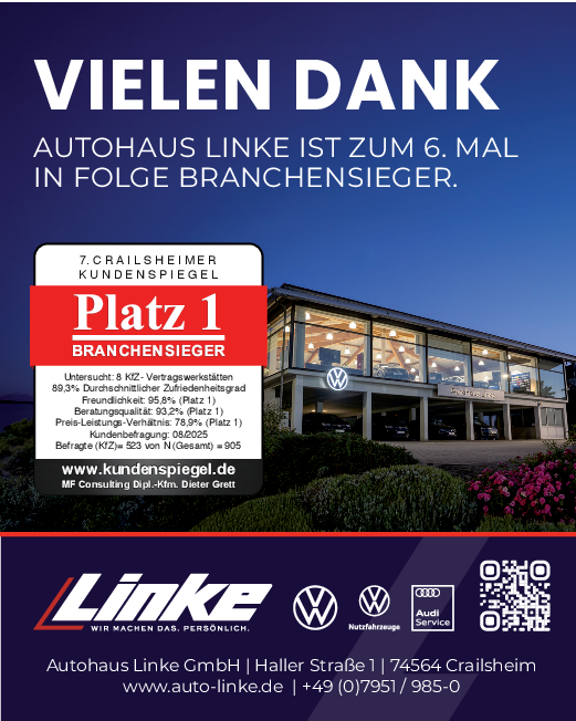 Bereits zum sechsten Mal in Folge wurde das Autohaus Linke von den Crailsheimerinnen und Crailsheimern zur besten Vertragswerkstatt unter den örtlichen Autohäusern gewählt.