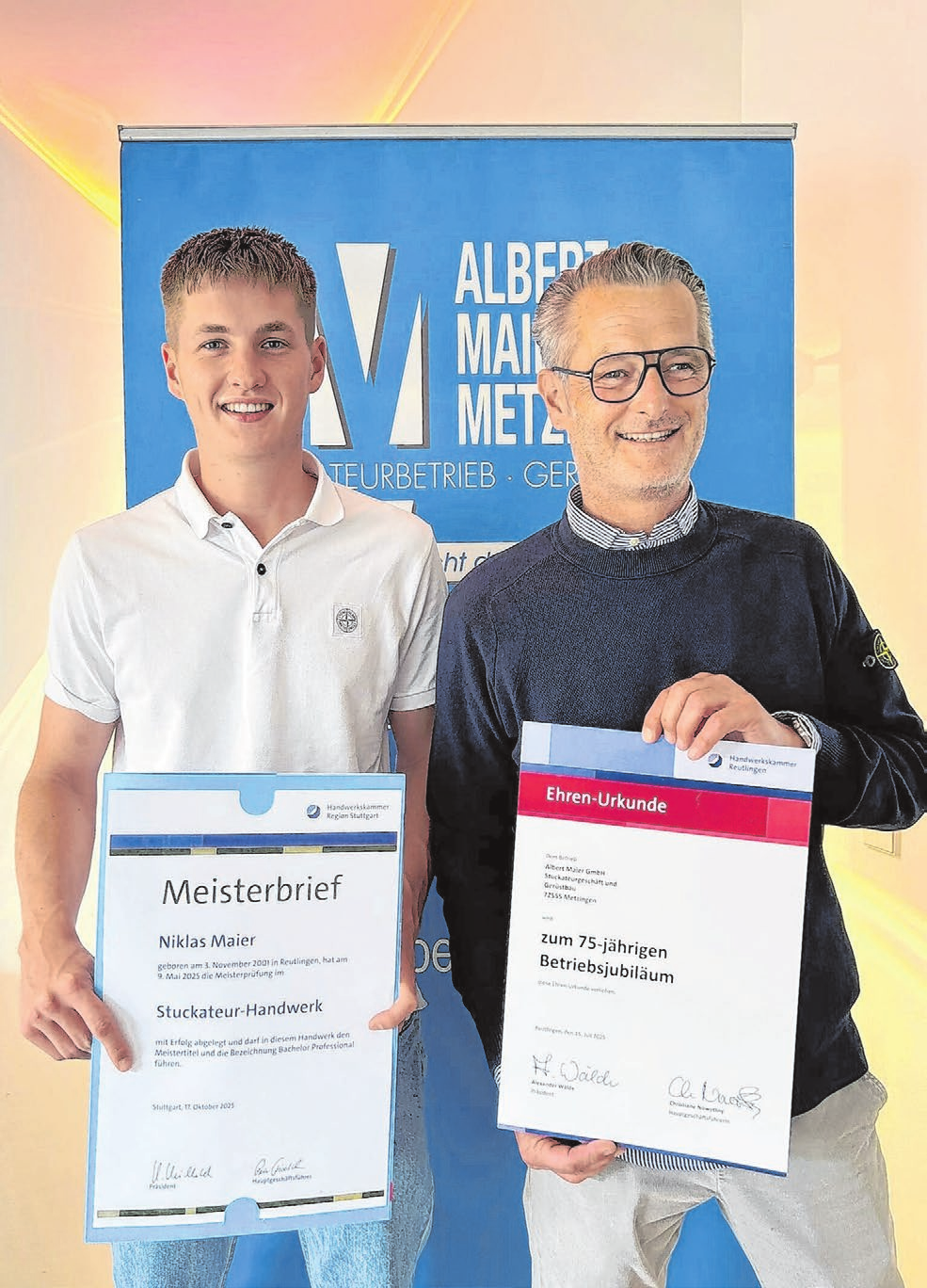 Jetzt, zum 75. Geburtstag des Metzinger Handwerksbetriebs, sehen die Maiers die Zeit reif für die nächste Generation. Und das Timing passt perfekt: Seit April dieses Jahres darf sich der 23-jährige Niklas Maier, Sohn des heutigen Firmenchefs, Stuckateurmeister nennen.