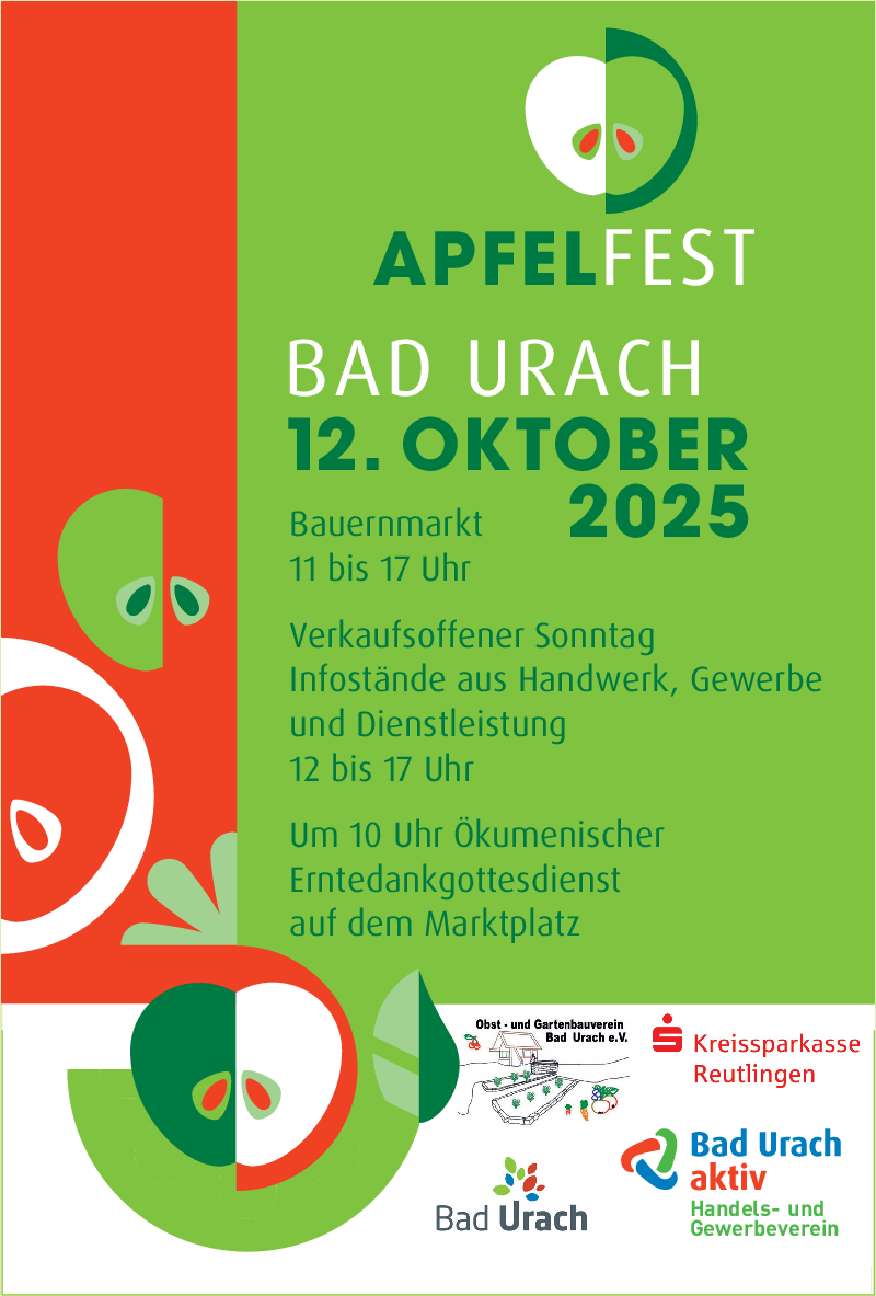Bad Urach feiert sein Apfelfest und den verkaufsoffenen Sonntag am 12. Oktober von 11 bis 17 Uhr und lädt zu einem Tag mit einem spannenden, vielfältigen und genussvollen Angebot ein.