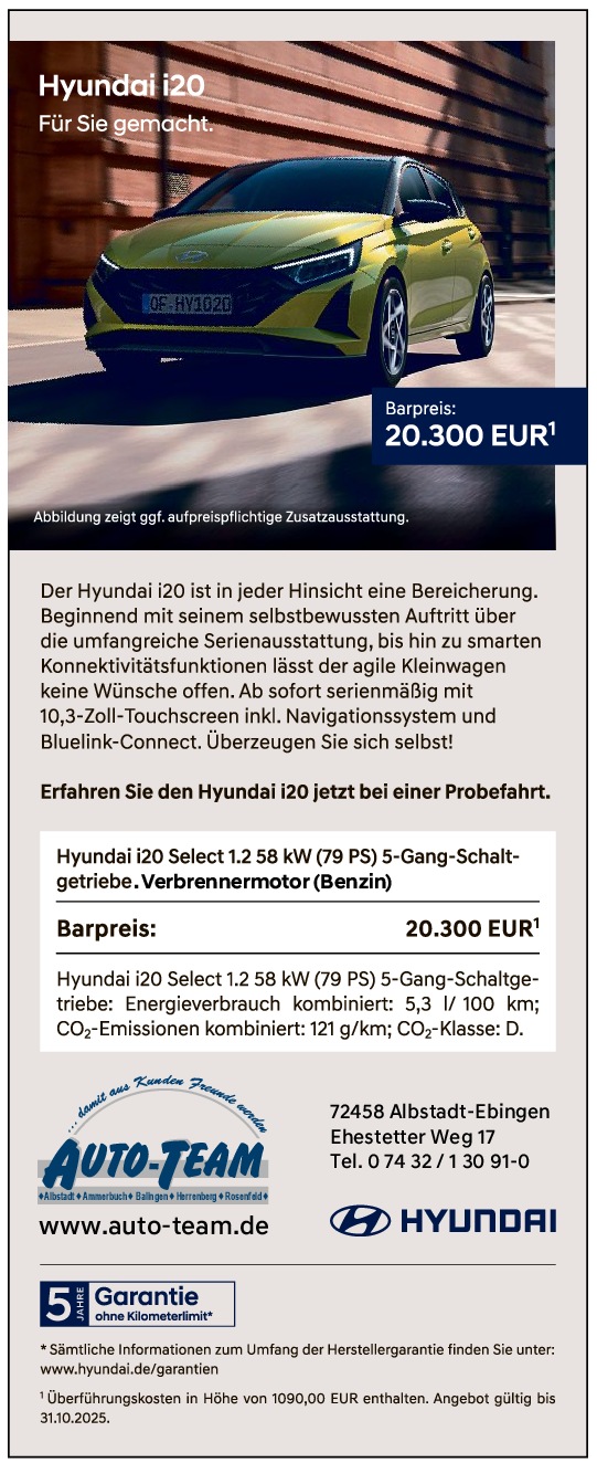 Ohnehin könne nun an den folgenden Standorten agiert werden: Balingen (Hauptsitz), Albstadt, Ammerbuch, Herrenberg und Rosenfeld. Verkauft wird die komplette Hyundai-Fahrzeugpalette, repariert bis hin zum Kundendienst werden natürlich auch Fremdmarken. Freundlich und fachkundig werden die interessierten Kunden durch das kompetente Mitarbeiterteam beraten und bedient.