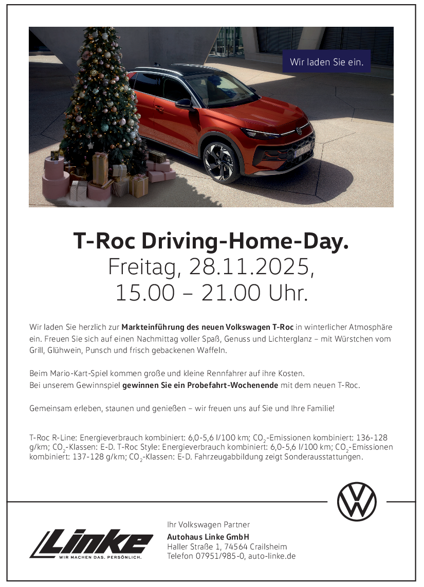 Nur zwei Tage später, am Freitag, 28. Februar, steht eine automobile Neuvorstellung an: „Wir präsentieren den neuen VW T-Roc in Crailsheim in weihnachtlich-winterlicher Atmosphäre“, sagt Pascal Linke vom Autohaus Linke. Neben dem sportlich-kompakten SUV, das der Wolfsburger Hersteller ausschließlich in Benzin-Hybridvarianten anbietet, warten Glühwein, Punsch, Würstchen und ein Gewinnspiel auf die Besucher. Für die Kleinen steht eine Runde „Mario Kart“ auf dem Beamer an, während sich die Großen voll und ganz auf den neuen VW konzentrieren können.