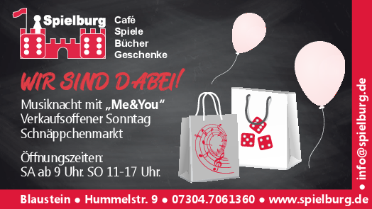 Zu unterhaltsamen Aktionen für Kinder laden der CVJM Blaustein und die Christlichen Pfadfinder Blaustein am Blaustein Center ein. An der Blautalhalle findet der Nachwuchs Abwechslung und großes Vergnügen an der Spielstraße, durch die Jugend des Roten Kreuzes und Oberlin Ulm e.V.