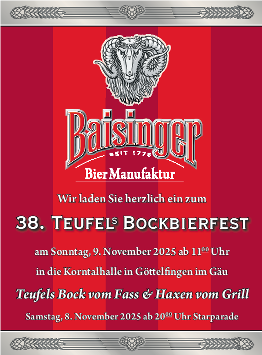 Das überregional bekannte und süffige Bockbier der „Baisinger BierManufaktur Familie Teufel“ gibt es natürlich an beiden Tagen neben weiteren Bierspezialitäten wie Baisinger Pils und Teufels Weisse. Auf Ihren Besuch freuen sich Förderverein und Musikverein „Eintracht“ Göttelfingen.