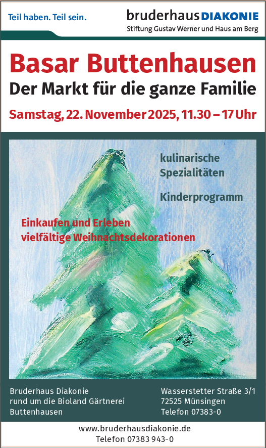 Am Samstag, 22. November, lädt die BruderhausDiakonie Buttenhausen herzlich zum stimmungsvollen vorweihnachtlichen Basar ein. Von 11.30 bis 17 Uhr erwartet die Besucherinnen und Besucher ein vielfältiges Angebot für alle Sinne. Dabei stehen kulinarische Genüsse ebenso im Mittelpunkt wie liebevoll Selbstgefertigtes.