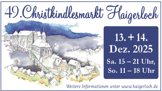 Der 49. Haigerlocher Christkindlesmarkt öffnet am Samstag, 13. Dezember, von 15 bis 21 Uhr, sowie am Sonntag, 14. Dezember, von 11 bis 18 Uhr seine Pforten.