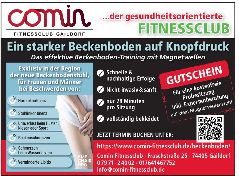 Der Comin Fitnessclub in Gaildorf bietet ein neues Training der Beckenbodenmuskulatur an: den EMP Chair Pro. Der Beckenbodenstuhl nutzt fortschrittliche Magnetwellentechnologie. So soll Betroffenen, die unter Beckenbodenschwäche leiden, schnell und anhaltend geholfen werden.