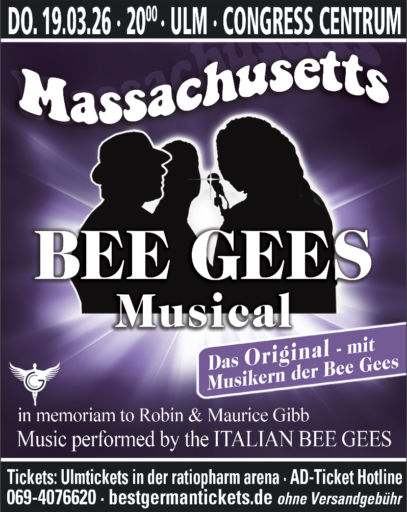 Massachusetts – Bee Gees Musical am 19. März 2026 um 20 Uhr im Congress Centrum Ulm. Karten für diese Veranstaltung sind erhältlich bei der Ulmticket-Vorverkaufsstelle in der Neu-Ulmer ratiopharm arena, unter der AD-Ticket Hotline 069/4076620 oder online unter www.bestgermantickets.de
