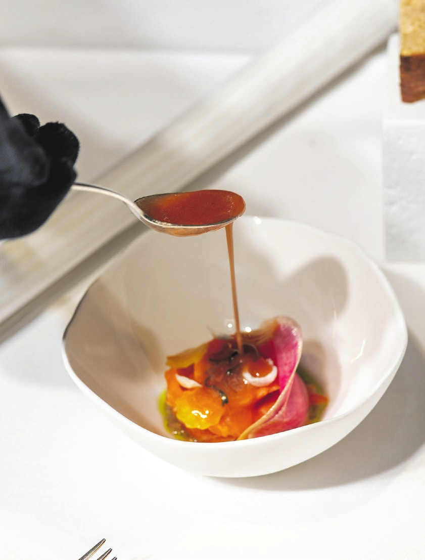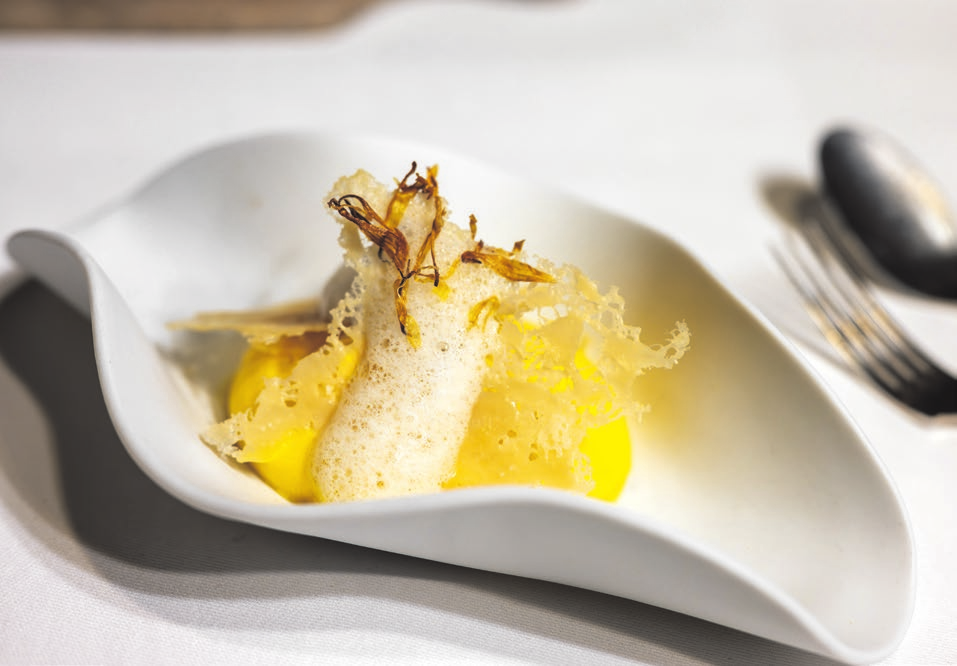 Mit dem zweiten Gang hebt Coronas Innovationskraft endgültig in den Genusshimmel ab. Seine „Nuvole Gialle“, zu Deutsch gelbe Wolken, bestehen aus mit Safran verfeinertem Parmigiano Reggiano in sieben verschiedenen Variationen: Je tiefer der Löffel gräbt, umso vielfältiger die kulinarischen Schätze in diesem raffinierten Zusammenspiel aus verschiedenen Texturen, Temperaturen und Geschmackserlebnissen. Der italienische Starkoch Massimo Bottura etablierte die Idee, den klassischen italienischen Hartkäse diversen Metamorphosen zu unterziehen. Corona füllt ein muschelförmiges Schälchen mit Parmesancreme, Parmesaneis, frischem Parmesan und Parmesan-Crumble, Parmesan-Chips und Schaum und versteckt zusätzlich noch gepickelte Topinambur und eine selbst gemachte Löwenzahnmarmelade. Dazu eine kleine Bresaola-Spirale auf frittiertem Brot.