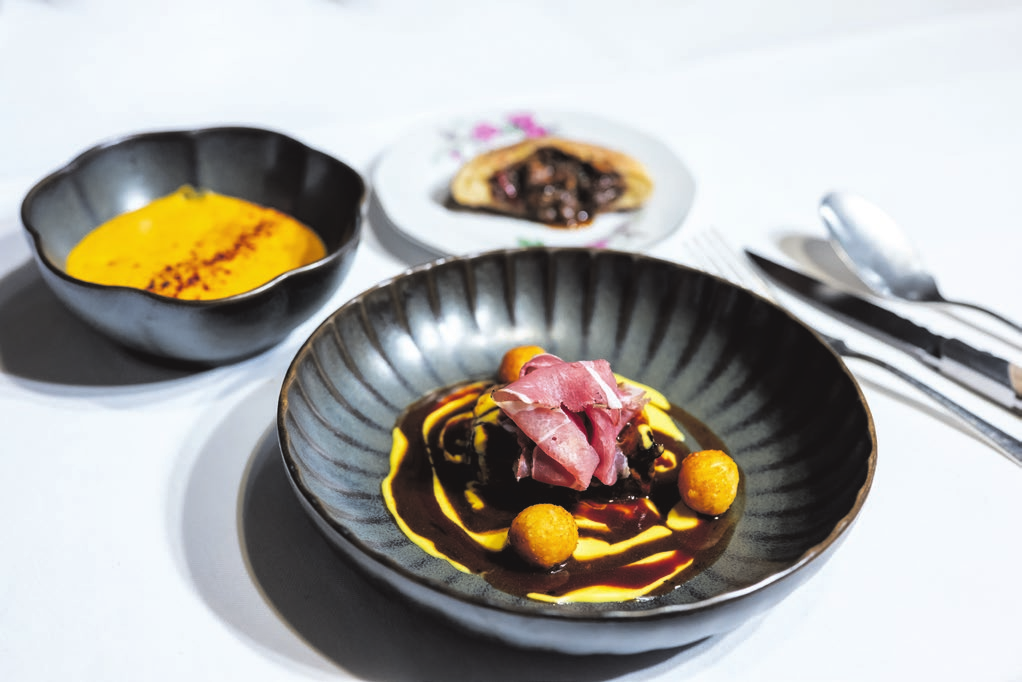 Als wäre das nicht genug, folgt darauf noch ein freches kleines Amuse-Bouche, eine „Mundfreude“: die beliebte Carbonara des Hauses in dekonstruierter Form. ZartestesRagout vom weißen Chianina-Rind aus der Toskana, bedeckt von Carbonara-Schaum, fluffig, buttrig und geschmacksintensiv, on top ein Demeter-Eigelb, das - gebeizt und im Ofen getrocknet - in Hobeln gemeinsam mit Guanciale-Speck auf dem leuchtend gelben Schaum landet. Die Geschmacksrezeptoren endgültig zum Tanzen bringen eine Mikrodosis fermentierte Sojabohne und etwas Pfeffer. Diese Schäume sind wahrhaft Träume!