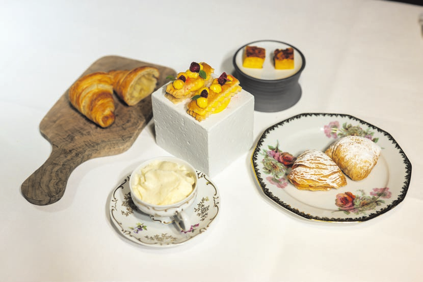 Das Dessert steht im Zeichen italienischer Romantik: Hinter dem „Frühstück in Florenz“ verstecken sich traditionelle und aufwändig hergestellte Gebäckteilchen. Hausgemachte Butter-Cornettos, Sfogliatelle (eine kleine, knusprige Blätterteigpastete, gefüllt mit Hartweizencreme), ein bildschönes Blätterteigküchlein mit Vanillecreme und Walderdbeeren sowie mit Safran und Vanille verfeinertes Milchreisküchlein in Würfelform.