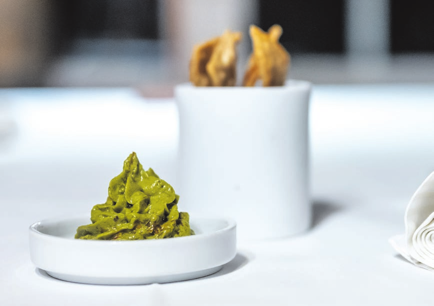 Bevor es mit dem Menü losgeht, grüßt die Küche mit einem edlen Snack, einer italienischen Interpretation von Nachos mit Guacamole: Pistazien-Tomaten-Ricotta-Creme mit Oliven und Chips aus knusprigem norditalienischem Piadine. Unfassbar, wie hier die charakteristisch glatt-glänzende Frische der Avocadocreme nachgebildet und dabei in eine völlig neue Richtung entwickelt wird.