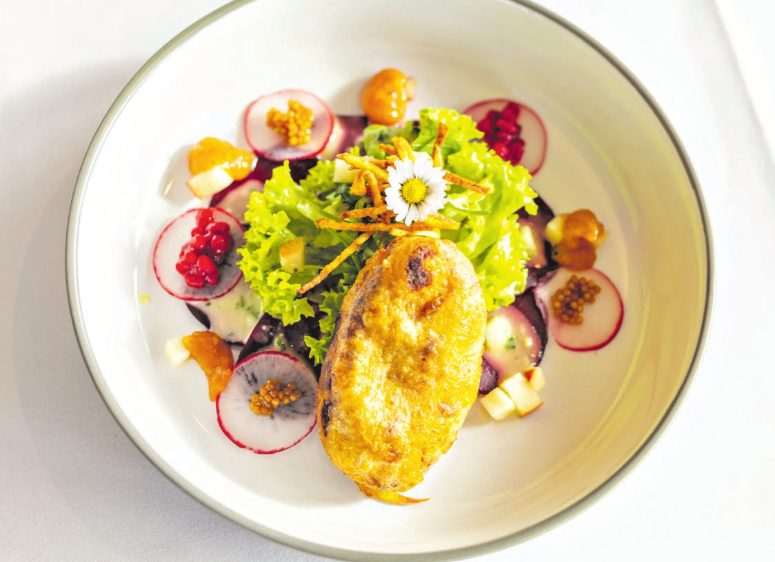Es lohnt sich, noch vor dem ersten Bissen die farbenfrohen Ingredienzien auf dem Teller zu bestaunen: Papa Rellena, ein Gericht aus Peru, das mit seinem ausgewogenen Geschmack punktet. Im Fokus befindet sich die mit Oliven, Rosinen, gekochtem Ei und gemischtem Hack gefüllte und goldbraun frittierte Kartoffel – außen knusprig, innen fluffig-cremig. Umrahmt von Rote-Bete-Carpaccio, kleinen Apfelwürfelchen in Quittenmarmelade sowie einem Rucola-Lollo-Rosso-Eisberg-Salat, dessen Leichtigkeit dank der dezenten Essig-Honig-Vinaigrette inklusive crunchy Topping nicht verloren geht. Aromatisch munden die Radieschen-Scheiben, die garniert mit eingelegten Senfkörnern und Rote-Beete-Kaviar entweder für Biss, pikante Würze oder eine süßlich-erdige Note mit feiner Säure sorgen.