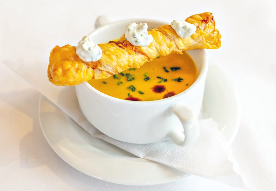 Da haben sich tatsächlich zwei Früchtchen gefunden: Herr Hokkaido (botanisch gesehen ist der Kürbis eine Beerenfrucht) aus Japan und Fräulein Mango aus Spanien. Entstanden ist eine unglaublich leckere und fein abgeschmeckte Suppe, die mit ihrer cremigen Konsistenz begeistert. Nicht zu dünn, nicht zu dick – sondern perfekt. Der Clou sind die unerwarteten Kräuterklößchen sowie die selbstgebackene knusprige Käsestange mit Kräuterquark. Zu den ersten beiden Gängen wird ein fruchtiger Kerner, halbtrocken, gereicht. Mit seiner feinen Restsüße und lebendigen Frucht unterstreicht er die frischen und leicht süß-säuerlichen Noten der Gerichte.