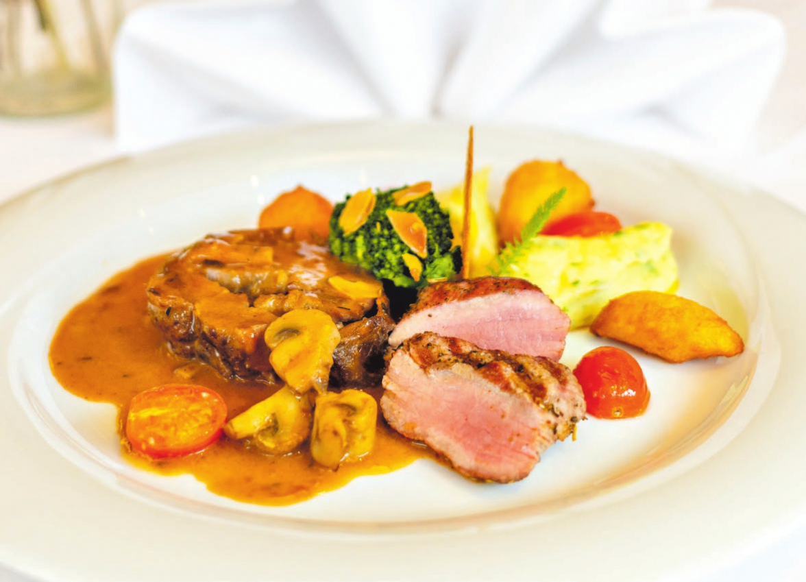 Jetzt wird's schwäbisch-lecker mit einem auf den Punkt gebratenen Alb-Lamm und einem Bratenstück, angerichtet auf einer reduzierten Pilzrahmsoße, in der sich Champignons und Austernpilze hervorheben. Wunderbar dazu passen die Dauphine-Kartoffeln, innen butterweich und außen knusprig-kross, die geschmacklich voll ins Schwarze treffen. Fruchtig-aromatische Abwechslung liefern geschmolzene Tomaten und Petersilien-Sellerienocken. Zum Hauptgang wird ein im Holzfass gereifter, kräftig-trockener Zweigelt gereicht. Seine weichen Tannine und würzigen Röstaromen verbinden sich besonders schön mit Fleisch und Beilagen.