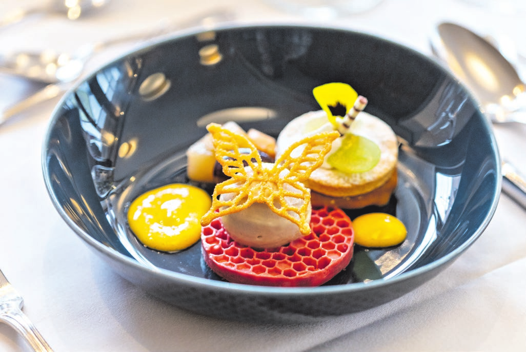 Lucuma wird auch das „Gold der Inkas“ genannt, eine in den peruanischen Anden beheimatete, nährstoffreiche Superfrucht mit intensiv gelbem Fruchtfleisch. Ein nussiger Geschmack mit leichter Karamellnote – in Peru ist sie der Hauptbestandteil der Eiscreme. Ein ebensolcher Genuss sind die selbstgebackenen Alfajores: Ein mürbes und doch feines Gebäck aus Maisstärke, dessen Füllung („Manjar Blanco“) aus einer dickflüssigen Karamellcreme aus Milch und Zucker besteht – köstlich. Gereicht mit Himbeer-Mousse und eingelegten Früchten in Weinschaumsoße eine rundum perfekte Kombination aus cremigen, knusprigen und geschmacksintensiven Komponenten. Zum Dessert greift der Küchenmeister den Bogen nochmals auf und begleitet den süßen Abschluss erneut mit dem fruchtigen Kerner.