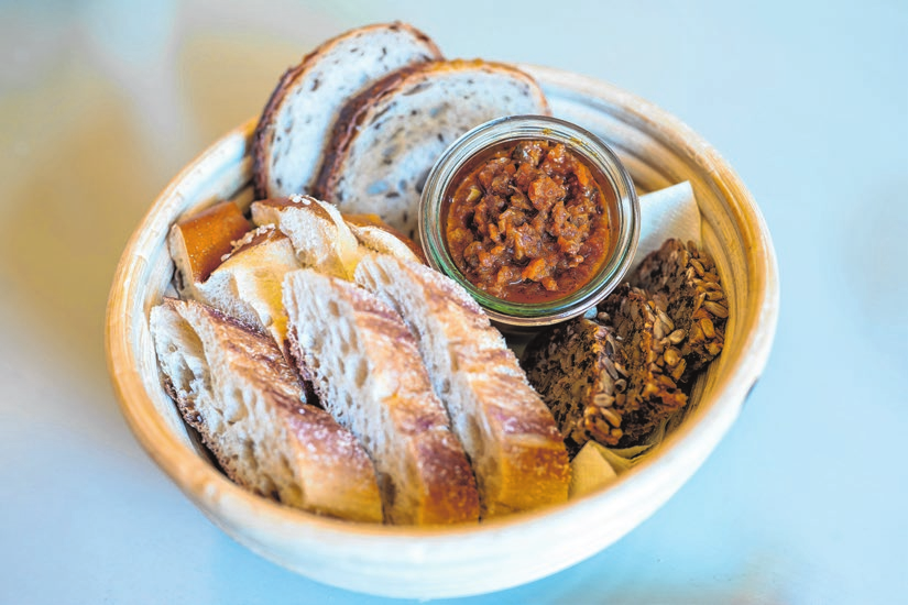 Perfekt eingeläutet wird das Menü mit einem Winzersekt Brut Nature, einer Cuvée aus Spätburgunder, Schwarzriesling und Chardonnay (42 Monate Hefelager) oder einem alkoholfreien Heppacher Quittensecco, jeweils eine Spezialität aus dem Weingut Klopfer aus Weinstadt-Großheppach im Remstal. Neben der goldgelben Farbe, zeichnet sich die oft unterschätzte Quitte durch ihren intensiv-fruchtigen, süßlich-säuerlichen Geschmack aus - ähnlich einer Mischung aus Apfel und Birne mit einer leicht zitronigen und dezent herben Note. Dazu gibt es Zacusc, ein in Rumänien beheimateter geschmorter Gemüseaufstrich aus Aubergine, Champignons, Karotte, Lauch, Sellerie, Tomate, Zucchini und Zwiebel gewürzt mit Pimentón de la Vera (geräuchertes Paprikapulver aus Spanien) und frisches selbstgebackenes Brot.