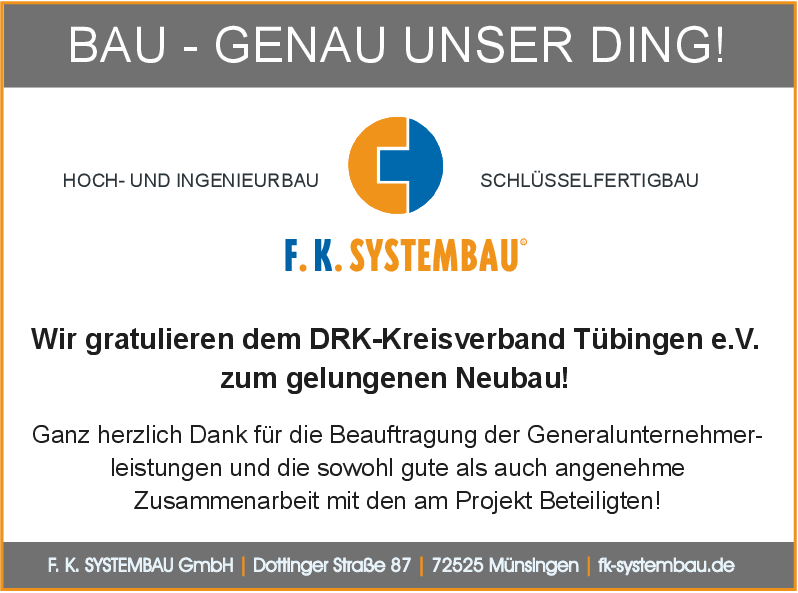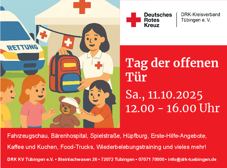Nachdem sich die Mitarbeitenden bereits bestens eingelebt haben, öffnet das DRK nun auch für die Bevölkerung die Türen: Am Samstag lädt das Team des DRK Tübingen herzlich in den Neubau im Steinlachwasen 26 ein. In und um das neue Gebäude erwarten Besucherinnen und Besucher viele spannende Angebote wie eine Fahrzeugschau von Rettungsdienst und Ehrenamt, eine Spielstraße mit Hüpfburg und Bärenhospital, Erste-Hilfe-Mitmachtstationen, ein Wiederbelebungstraining, beste Verpflegung und vieles mehr. Werner Bauknecht