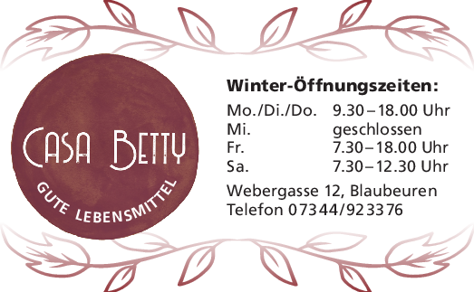 Kaffeeduft, bunt leuchtendes Gemüse, knusprige Brötchen bei entspanntem Treff: Seit September gibt es wieder ein abwechslungsreiches frisches Lebensmittel-Angebot verknüpft mit einer Imbiss-Möglichkeit in der „Casa Betty“ in der Blaubeurer Webergasse mitten in der Altstadt. Nachdem Laurin Mayer aus gesundheitlichen Gründen seinen Naturkostladen „Gmiasmayer“ schließen musste, sind viele frühere Kunden jetzt froh, dass Betty Gorin das Geschäft mit großem Bio-Sortiment und Essens-Angebote drinnen und draußen weiterführt.