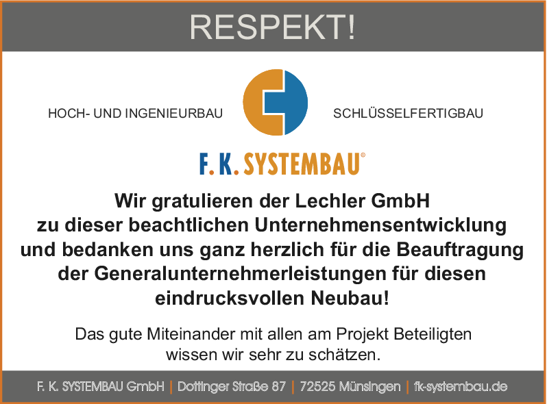 Nachdem schon im Jahr 2021 der Logistik-Neubau in der Paul-Lechler-Straße 5 erfolgreich fertiggestellt wurde, machten sich das Planungsteam der Fa. Lechler unter Leitung von Maxim Weinmann zusammen mit dem Planungsbüro Hank+Hirth Architekten aus Eningen u. A. erneut zusammen an die Arbeit.