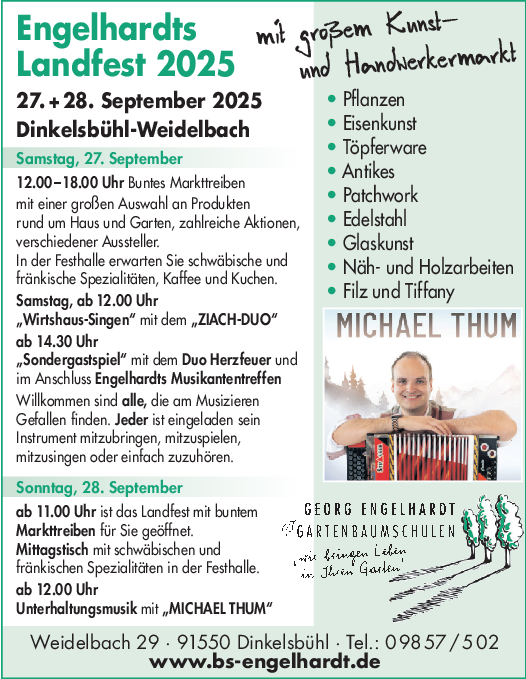 Das traditionelle Landfest der Baumschulen Engelhardt zieht jedes Jahr Scharen an Besuchern an. Heuer findet es am Samstag und Sonntag, 27. und 28. September, auf dem Betriebsgelände in Weidelbach bei Dinkelsbühl statt und verspricht wieder eine bunte Mischung aus Gartenkunst, Kunsthandwerk, Gartendesign und Unterhaltung.