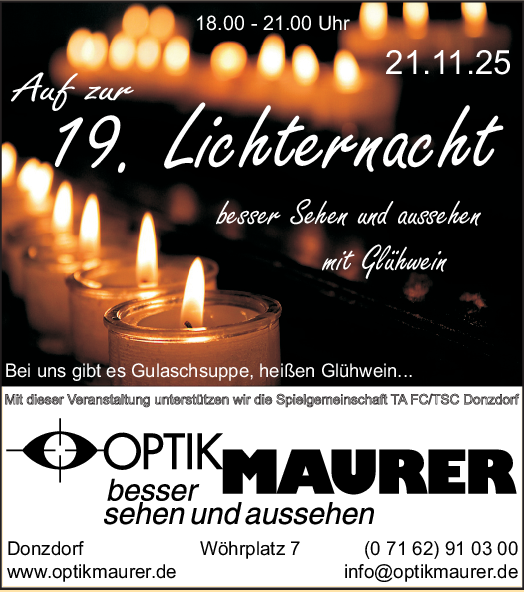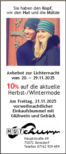 „Die Lichternacht ist mittlerweile fest im Veranstaltungskalender der Stadt etabliert“, sagt Wolfgang Nagel vom Donzdorfer Handels- und Gewerbeverein, der die Veranstaltung wieder organisiert hat. Zum Bummel bei Kerzen- und Lichterschein kämen nicht nur die Donzdorfer, sondern Gäste aus der ganzen Region. Die Geschäfte sind vorbereitet, sie bieten neben einem breiten Sortiment natürlich auch Beratung, Schnäppchen zum Lichterevent und einige Aktionen, die noch nicht verraten werden. Ob Brillen, Hüte, Schuhe, Bekleidung, Blumen, Pflanzen und Geschenkartikel, es wird vieles angeboten und das eine oder andere Präsent für den Nikolaustag oder Weihnachten findet sich sicherlich auch schon – der erste Advent steht bereits vor der Tür, das Weihnachtsfest ist nicht mehr weit und da kommt der abendliche Einkaufsbummel genau zur richtigen Zeit.