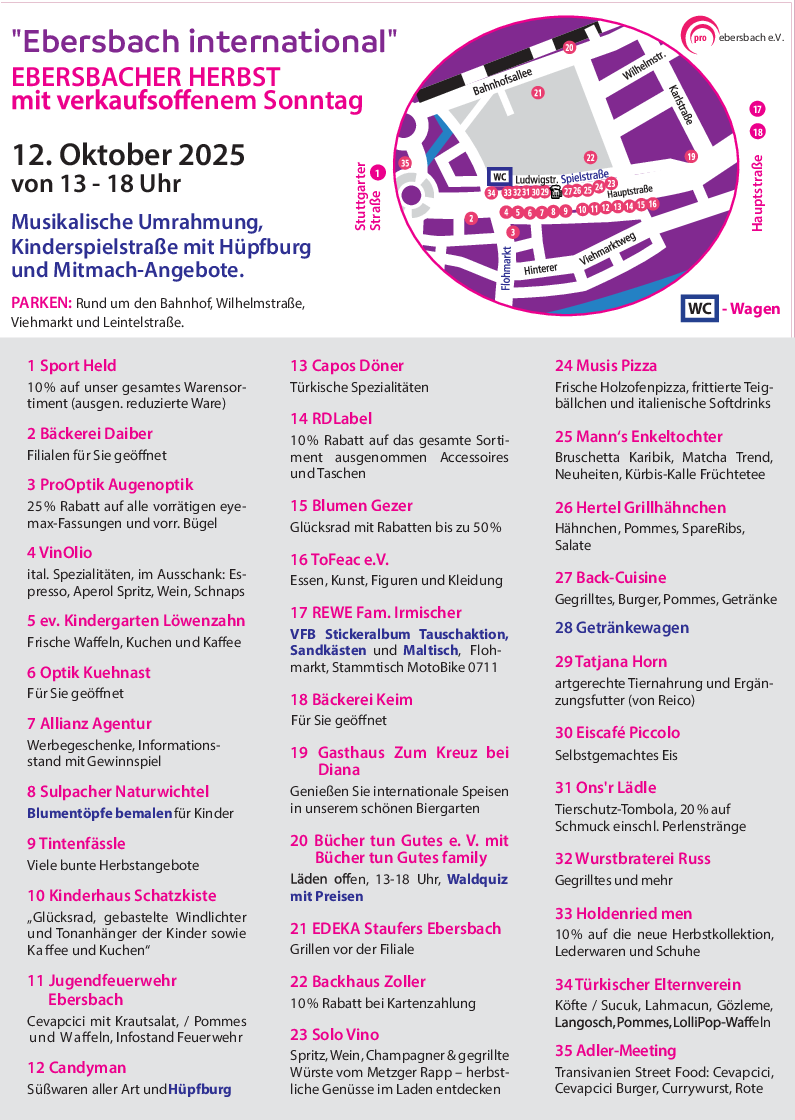 Am Sonntag, dem 12. Oktober, lädt der Verein Pro Ebersbach herzlich zum traditionellen Ebersbacher Herbst mit Tag der offenen Tür ein. Von 13 bis 18 Uhr erwartet die Besucherinnen und Besucher ein vielfältiges und internationales Festprogramm unter dem Motto „Ebersbach international“ – ein Fest, das Kulturen verbindet, den Herbst feiert und Groß und Klein zusammenbringt.