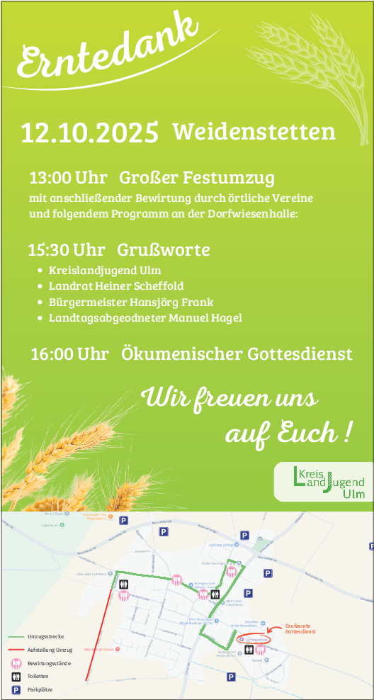 Dieses Jahr passt in Deutschland alles zusammen: Erntedank wurde am 5. Oktober gefeiert, mit vielen Aktivitäten vor Ort. Darum veranstaltet die Kreislandjugend Ulm ihren großen Umzug eine Woche später, am Sonntag, 12. Oktober, ab 13 Uhr in Weidenstetten – wenn alle Zeit haben. Nach acht Jahren wieder und mit 50 Gruppen.