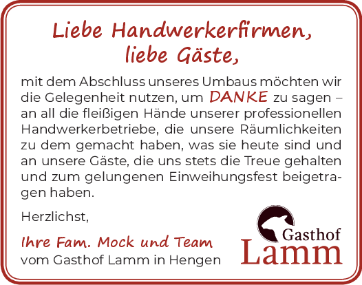 Sämtliche Arbeiten wurden von örtlichen und regionalen Handwerksbetrieben ausgeführt, alles „zu unserer größten Zufriedenheit“. Damit hat sich der Gasthof Lamm für die Zukunft gut aufgestellt. Mit Alexander Mock steht die vierte Generation am Herd. Simone Mock, seine Frau, ist im administrativen Bereich tätig. Die ganze Familie zieht an einem Strang. Bei durchschnittlich 60 Tagesessen und vollbesetzten Stühlen auf den 150 Sitzplätzen in der Gastwirtschaft und im Saal an Wochenenden oder bei Veranstaltungen ist dies auch nötig, wie sie betonen.