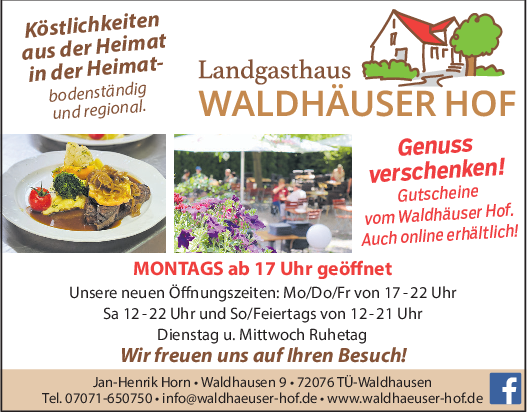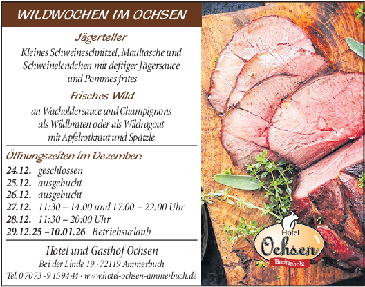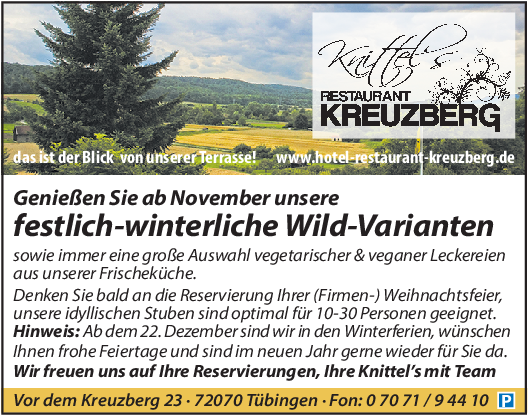 Jetzt, im Winter und zur Adventszeit, gibt es nicht nur die beliebten schwäbischen Klassiker, sondern auch Feines für diese Jahreszeit mit Bauernente, Wild und regionaler Quitte. Dazu auch immer kreative vegetarische und vegane Leckereien, hausgemachte Sorbets, Parfaits und mehr. Desserts und ein guter Roter gehen schließlich immer. Die beheizte, stimmungsvolle Winterlounge bietet sich an milden Tagen für einen Punsch oder Apéro vor der Weihnachtsfeier, dem Feierabend-Get-Together oder dem Familienfest an. Gemeinsam setzt das Team vom Kreuzberg Ideen für ein Fest gemeinsam mit ihren Gästen um. Mit den ersten Frühlingstagen ist auch wieder die idyllisch-begrünte Terrasse und der Biergarten mit dem wunderschönen Ammertalblick geöffnet. Für Kids gibt es einen kleinen, gut einsehbaren Spielplatz, eine tolle Kinder-Karte und als Highlight die legendäre Schnitzeljagd durchs Haus mit Kurzbesuch in der Küche und der Eisecke ...