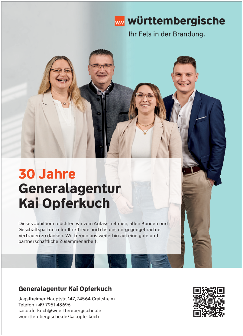Im Jahr 1995 machte sich Kai Opferkuch mit seiner eigenen Generalagentur der Württembergischen Versicherung selbstständig. Bereits zuvor hatte er als Angestellter - das Gebiet rund um Jagstheim betreut und begonnen, die ehemalige Ortsagentur auszuweiten. Heute betreibt der 54-Jährige eine erfolgreiche Generalagentur mit rund 2000 betreuten Kunden und über 16.000 laufenden Verträgen.