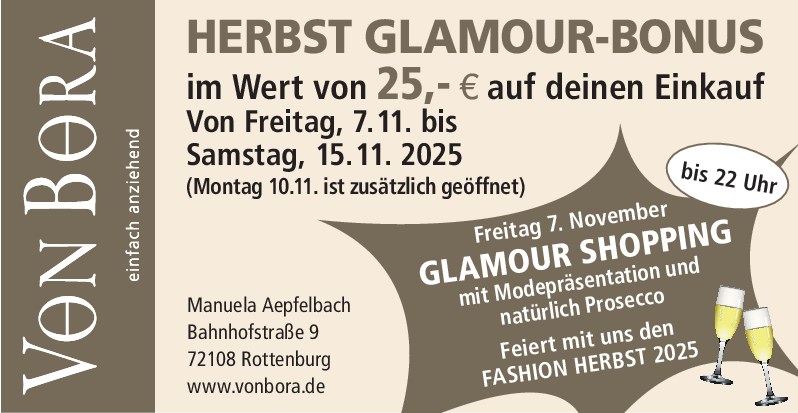 Glamour Shopping: Freitag, 7. November, von 16 bis 22 Uhr, Lichtershow 18.30 Uhr, Feuershow 20 Uhr