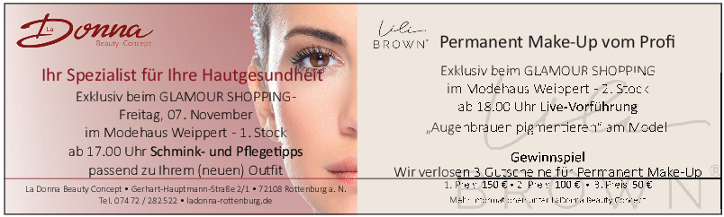 La Donna Beauty Concept bietet Schmink- und Pflegetipps vom Profi, coole Musik sorgt für die passende Stimmung. Dazu gibt es eine Aktion mit Rich&Royal und beim Einkauf gibt es eine Glamour Bag geschenkt.