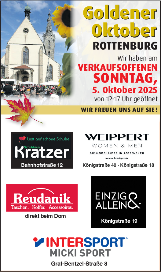Auch die Rottenburger Einzelhändler freuen sich auf die Gäste aus nah und fern. Die Geschäfte der aktiven Händler sind von 12 bis 17 Uhr geöffnet.