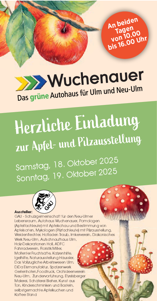 Zusammen mit der GAU, dem Gerlenhofer Arbeitskreis Umweltschutz – Schutzgemeinschaft für den Neu-Ulmer Lebensraum e. V. veranstaltet das Autohaus Wuchenauer seit 1988 regelmäßig eine Apfel- und Pilzausstellung. Ein Wochenende lang machen die PKWs im Showroom Platz für die Messe des Naturschutzvereins. Rund 30 verschiedene ökologische und nachhaltige Aussteller aus der Region sind dieses Mal mit ihren Angeboten und Informationsständen mit dabei. Die Besucher können sich nicht nur auf Experten in Sachen Äpfel und Pilze freuen, sondern auch an den Ständen der Aussteller vorbeischlendern. Diese stellen im Ausstellungsraum des Autohauses ihre Kunstwerke und regionalen Produkte vor. Natur sei das große Thema, was alle Aussteller miteinander verbinde, aber auch das Thema Nachhaltigkeit spiele eine große Rolle, so Geschäftsführerin Lisa Wuchenauer. Deshalb seien auch soziale Einrichtungen mit ihren Informationsständen bei der Ausstellung mit dabei, führt sie aus.