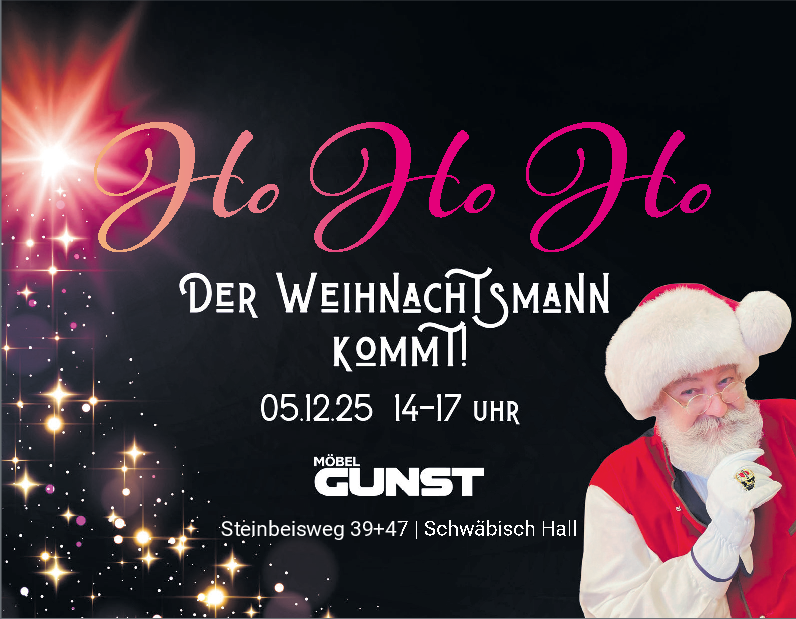„Ho, ho, ho!“ klingt es am 5. Dezember durch die Ausstellung von Möbel Gunst in Schwäbisch Hall. Der Weihnachtsmann höchstpersönlich macht von 14 bis 17 Uhr Halt im Möbelhaus. Alle Kinder – und natürlich auch die Großen – sind herzlich eingeladen, ihn zu besuchen. Wer mag, darf ein festliches Erinnerungsfoto machen – und für alle kleinen Gäste hat der Weihnachtsmann ein liebevoll ausgewähltes Geschenk dabei.