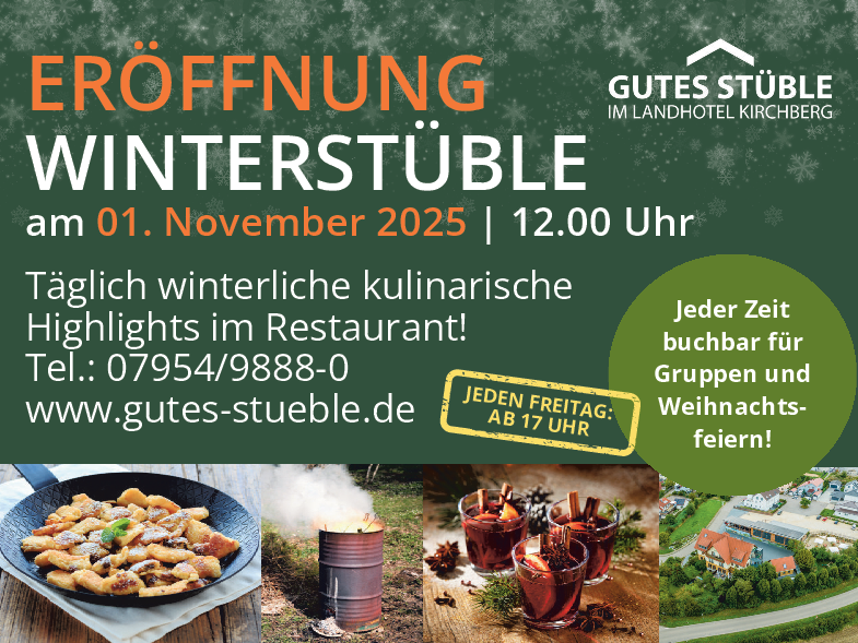 Ab Samstag, 1. November, ist das „Gutes Stüble“ im Landhotel Kirchberg der perfekte Ort, um die kühle Jahreszeit in behaglicher und geselliger Atmosphäre zu genießen. Denn dann öffnet um 12 Uhr draußen das „Winterstüble“. An knisternden Feuerkörben können sich die Besucher mit dampfendem Glühwein und fruchtigem Punsch aufwärmen und den Alltag hinter sich lassen. Für Spaß und Gemeinschaft wird als Outdoor-Spiel eine Bauernolympiade veranstaltet, die Groß und Klein begeistern soll. Am offenen Feuer kann gemeinsam Stockbrot gebacken werden. Ab dem 1. November ist das Winterstüble dann immer freitags ab 17 Uhr geöffnet. Kulinarisch erwartet die Gäste eine verlockende Auswahl: Herzhafte Riesen-Grill-Hot-Dogs, das hausgemachte Stüble-Winterbrot und süßer Kaiserschmarrn laden zum Genießen ein und sorgen für wohlige Momente. Wer will, kommt einfach vorbei, genießt die besondere Atmosphäre und verbringt eine schöne Zeit zusammen mit Freunden und Bekannten. Genuss und Gemütlichkeit verbinden sich im Stüble mit winterlicher Lebensfreude.