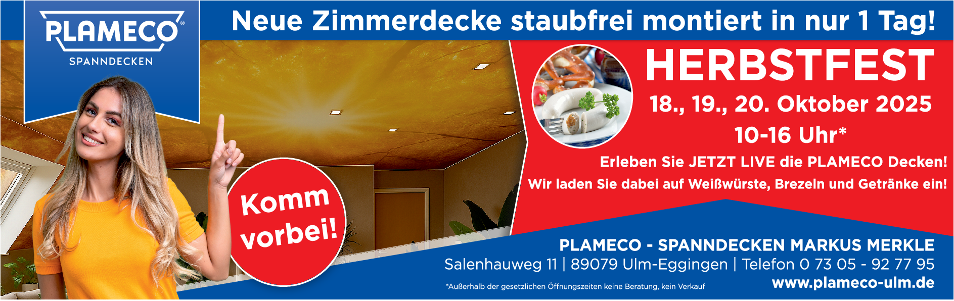 Wenn draußen die Blätter fallen und wir es uns drinnen gemütlich machen, rückt das eigene Wohngefühl in den Mittelpunkt. Wer schon lange von einer neuen Zimmerdecke träumt, sollte sich den Termin jetzt rot im Kalender markieren: Vom 18. bis 20. Oktober, jeweils von 10 bis 16 Uhr, lädt der Plameco Fachbetrieb Markus Merkle herzlich zum Herbstfest ein. Besucherinnen und Besucher können an diesen Tagen ganz in Ruhe entdecken, wie vielseitig und beeindruckend die Gestaltungsmöglichkeiten mit Plameco-Spanndecken sind.
