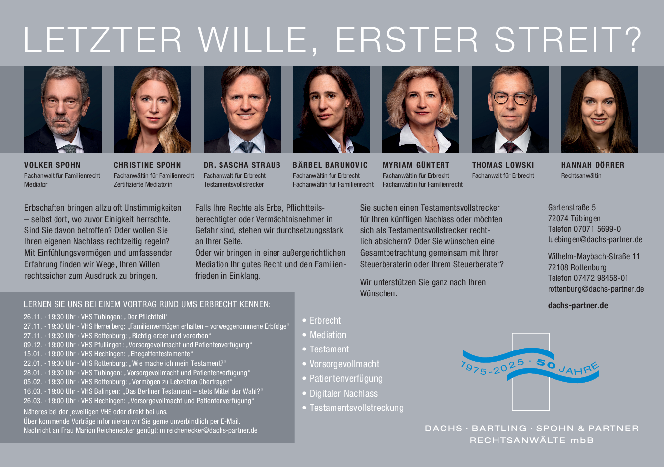 Zudem hilft ein Fachanwalt dabei, individuelle Wünsche rechtlich korrekt abzubilden und mögliche Fallstricke zu vermeiden. Er kann außerdem auf Besonderheiten wie Patchwork-Familien, Unternehmensnachfolge oder Pflichtteilsrechte eingehen. Durch seine Erfahrung erkennt er Risiken, die Laien oft übersehen. Ein professionell erstelltes Testament schützt somit vor unbeabsichtigten Konsequenzen. Gleichzeitig sorgt es dafür, dass das Vermögen gemäß den eigenen Vorstellungen verteilt wird. Schließlich vermittelt ein Fachanwalt Sicherheit und entlastet die Angehörigen im Ernstfall. So entsteht ein Testament, das sowohl rechtlich solide als auch persönlich stimmig ist.