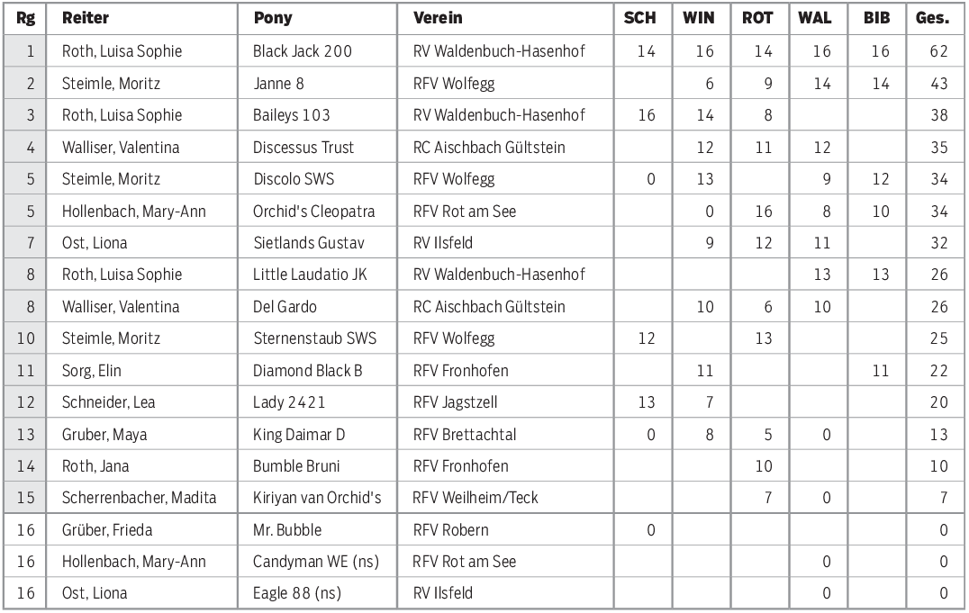 Für das Finale, das im Rahmen des Turniers in Bisingen-Hohenzollern am 02.-05.10.2025 ausgetragen wird, qualifizieren sich die 15 punktbesten Paare (kein Streichergebnis). In den Qualifikationen gilt folgendes Punktsystem: 16, 14, 13, 12, 11 usw. Reiter, die aufgeben oder ausscheiden erhalten 0 Punkte. Bei Gleichplatzierten werden die Punkte für diesen Platz doppelt vergeben. Die Punkte Qehen immer auf das Paar (Reiter/Pony).