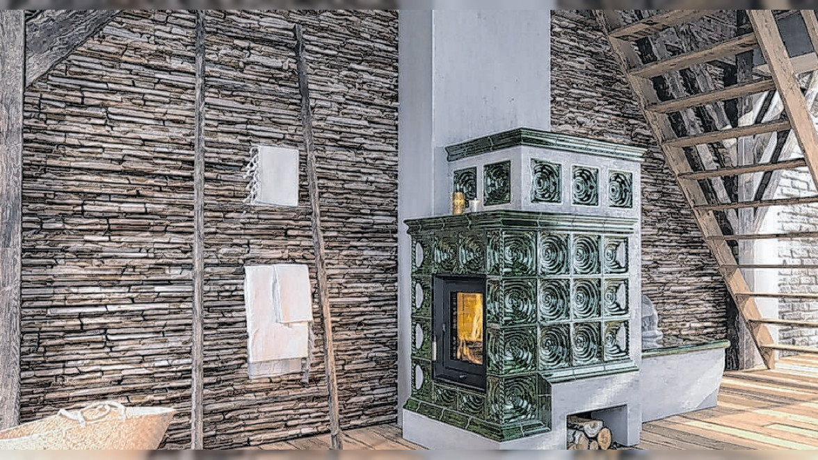 Ein mit Holz betriebener Ofen speichert die Wärme und gibt sie gleichmäßig über Stunden ab – für ein behagliches Wohnklima.