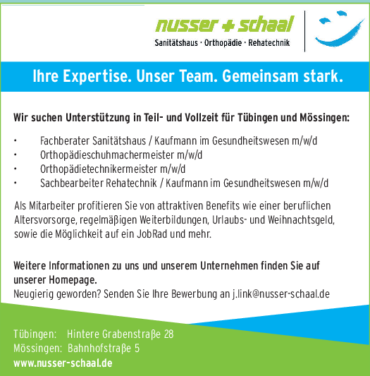 Sanitätshaus, Klinik, Pflegeeinrichtung, Privatpraxis oder mobile Angebote – in der Wirtschaftsregion Neckar-Alb gibt es zahlreiche Arbeitgeber aus der Gesundheitsbranche, die attraktive Karrierechancen und vielfältige Vorteile bieten. bru
