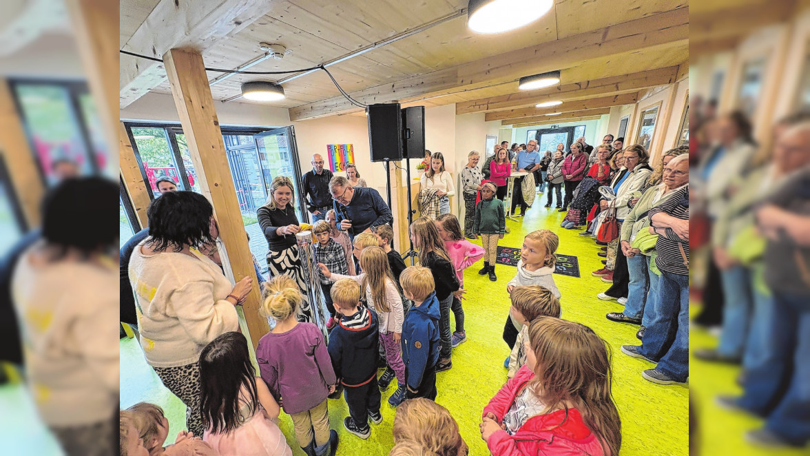 Darin enthalten sind auch Sanierungs- und Umbaumaßnahmen im Bestand, der mit zwei Pavillons und Zwischenbau mittlerweile auch schon 33 Jahre alt ist. Das bisher bereits offene Konzept kann durch die Übernahme der Kubatur auch weiterhin bestens sowohl in Form einer großen Gemeinschaft oder in der Arbeit mit Kleingruppen, mit Rückzugs-, Werkstatt- und Vorschulbereiche, Bauecke und U3-Bereich umgesetzt werden. „Und man findet Platz zum Lesen, Vorlesen, Zuhören und Fußballspielen“, sagte Münzing. Denn auch der Außenbereich wurde komplett neugestaltet. „Wir haben die Baustelle gerockt“, freute sich Erzieherin Lara Siegler und lobte insbesondere Einrichtungsleiterin Manuela Helbing, für die es vieles zu regeln, klären und machen gegeben habe: „Oft hat sie auch selbst Hand angelegt“. Denn: „Wir legen großen Wert darauf, dass sich unsere Kinder wohlfühlen, dass alle aufeinander achten und respektvoll miteinander umgehen.“ Mit dem anrührenden Rap „Hand aufs Herz“ untermauerten die Kinder diese Aussage und begeisterten auch mit dem größtenteils selbst inszenierten Puppenspiel von „Rotkäppchen“ die große Besucherschar aus Eltern und Großeltern, Planer, Handwerker und interessierten Bürgern. Maria Bloching